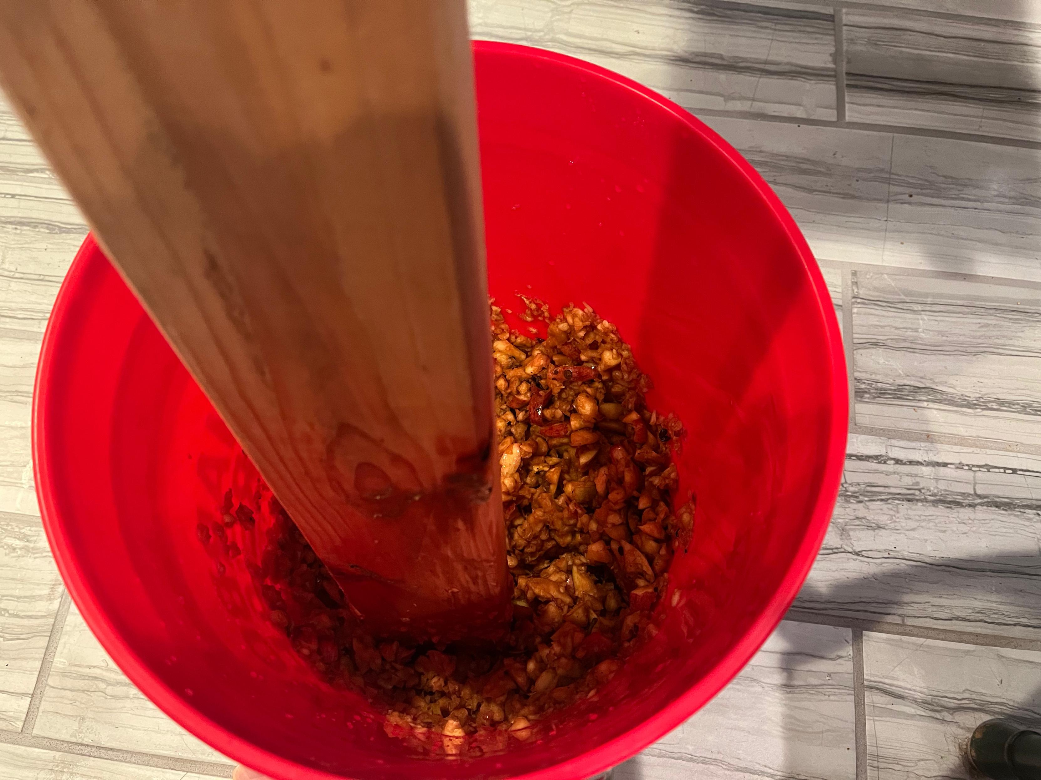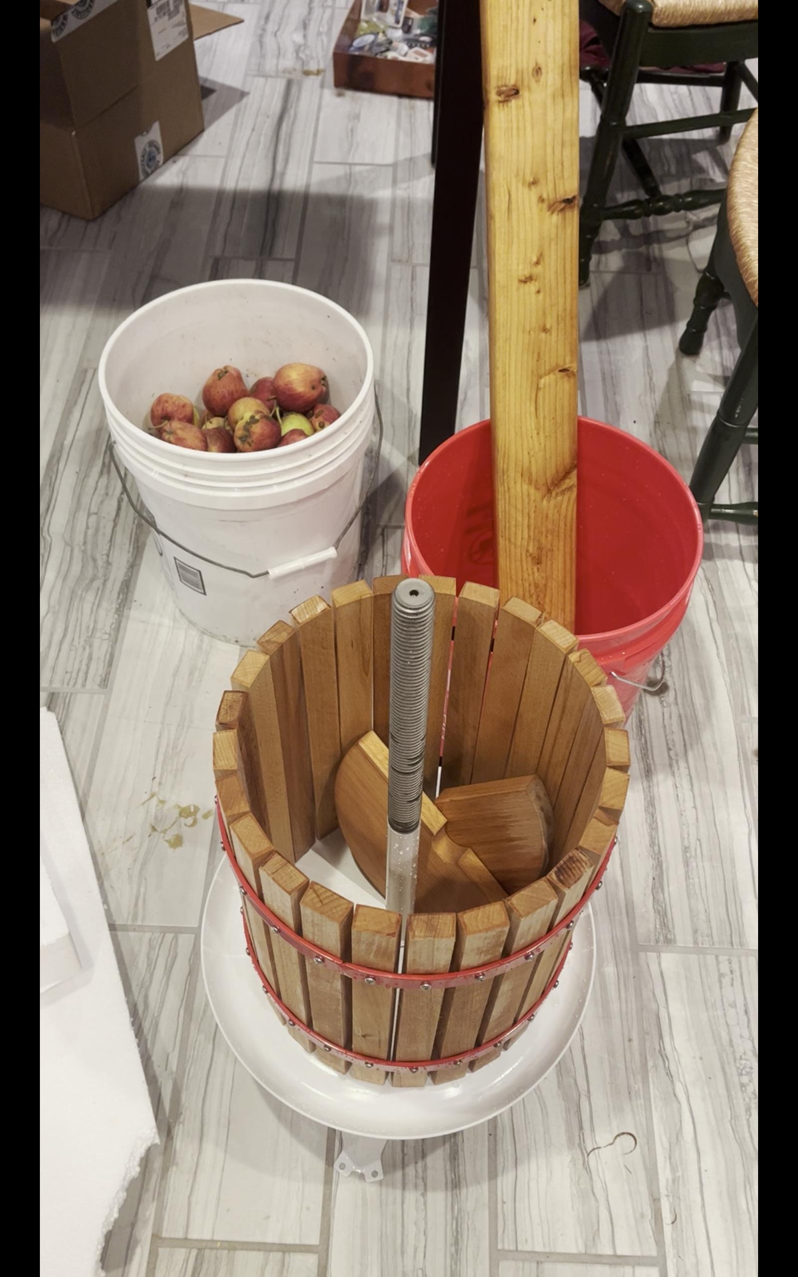 Apple cider dripping from a press into a container below