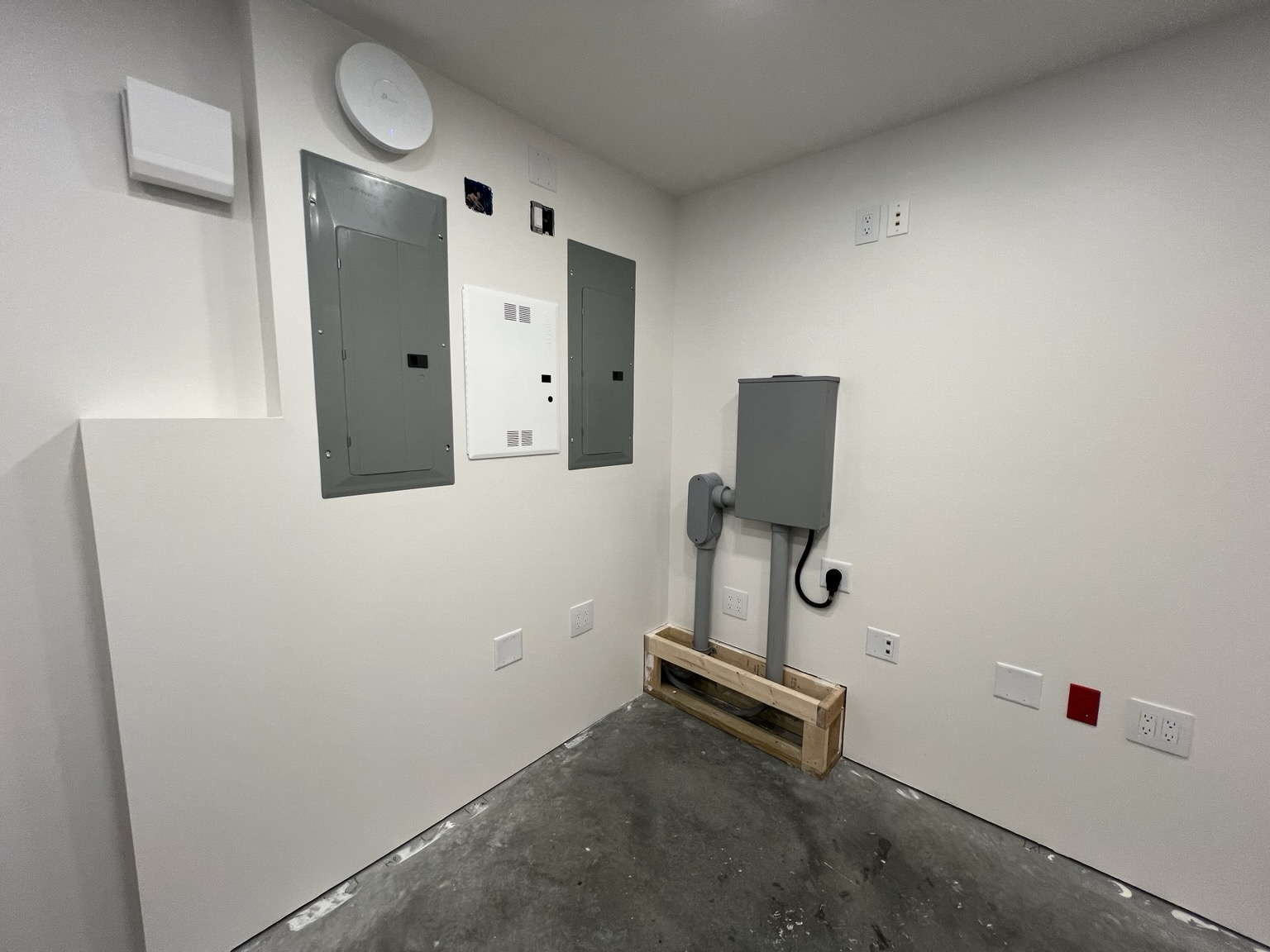 Reached a big milestone today - I got the transfer switch wired up to the electrical panels, so we finally have real power in the building. No more extension cords everywhere!