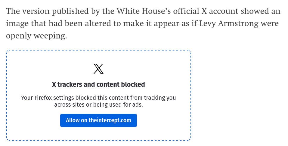 One last thing. For anyone allergic to X, proper browser settings should prevent the embedded content. I use Privacy Badger, but this placeholder implies that the blocking is native to #Firefox (probably because of the tracking).