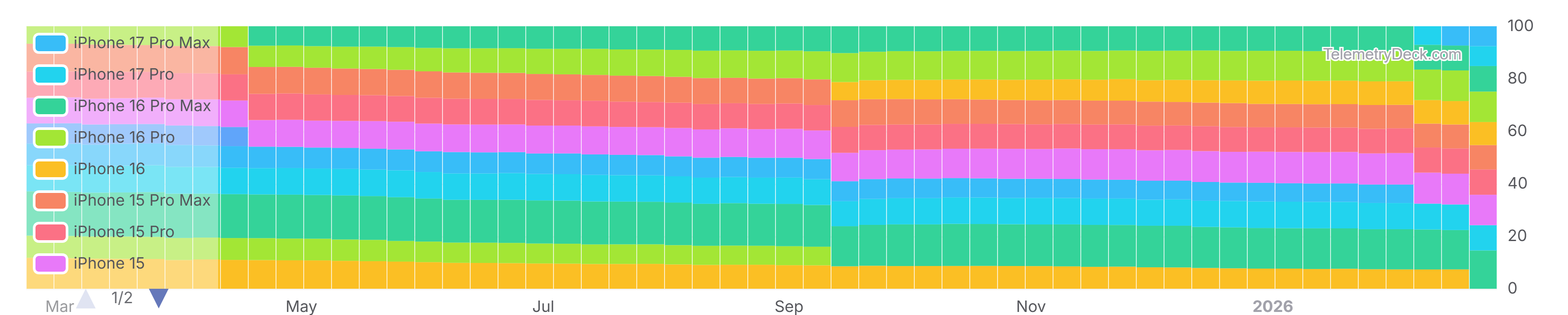 Check out the interactive chart: https://telemetrydeck.com/survey/apple/iPhone/models/?source=fediverse