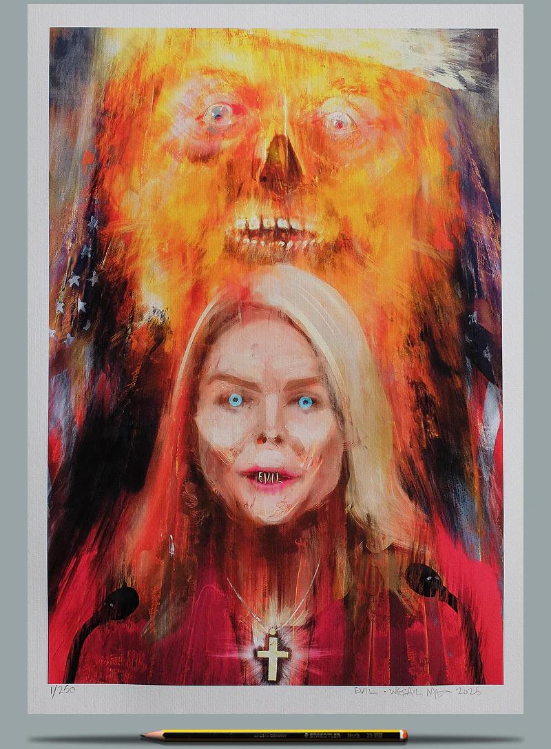 A bizarre painting of the Press Secretary with evil, piercing eyes and a glowing cross around he neck. She’s wearing a blood red love. Behind and above her is a spectral orange cloud that contains Trump’s face-as-skull.