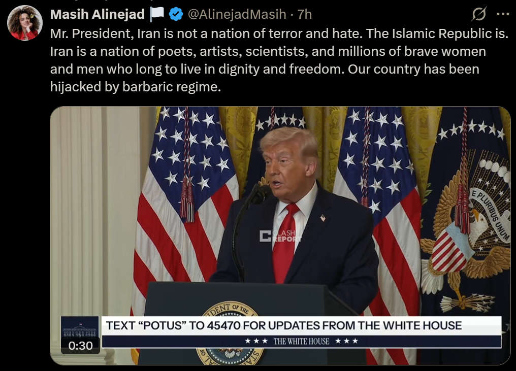 Masih Alinejad @AlinejadMasih " Mr. President, Iran is not a nation of terror and hate. The Islamic Republic is. Iran is a nation of poets, artists, scientists, and millions of brave women and men who long to live in dignity and freedom. Our country has been hijacked by barbaric regime."