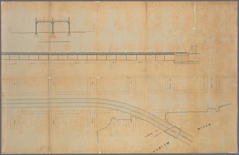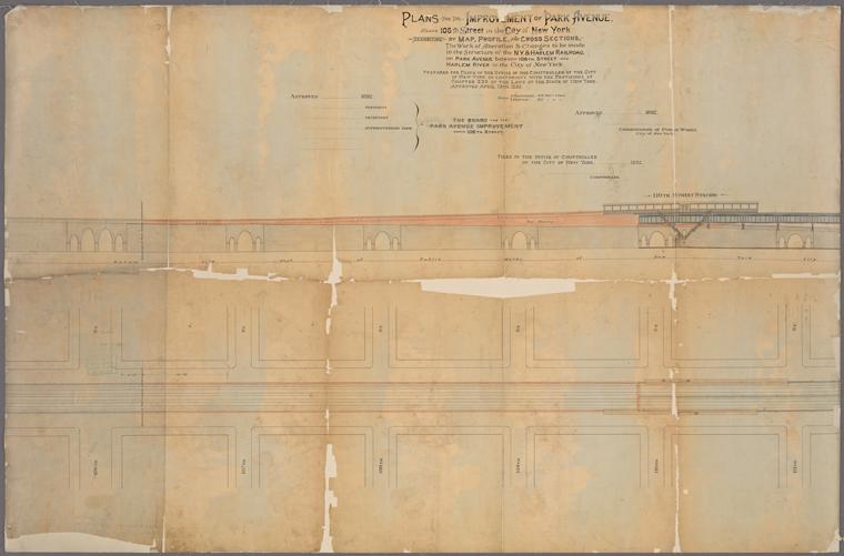 Plans for the improvement of Park Avenue, above 106th Street in the City of New York: exhibiting by map, profile, and cross sections, the work of alteration & changes to be made in the structure of the N.Y. & Harlem Railroad, on Park Avenue between 106th Street and Harlem River in the City of New York - NYPL Digital Collections