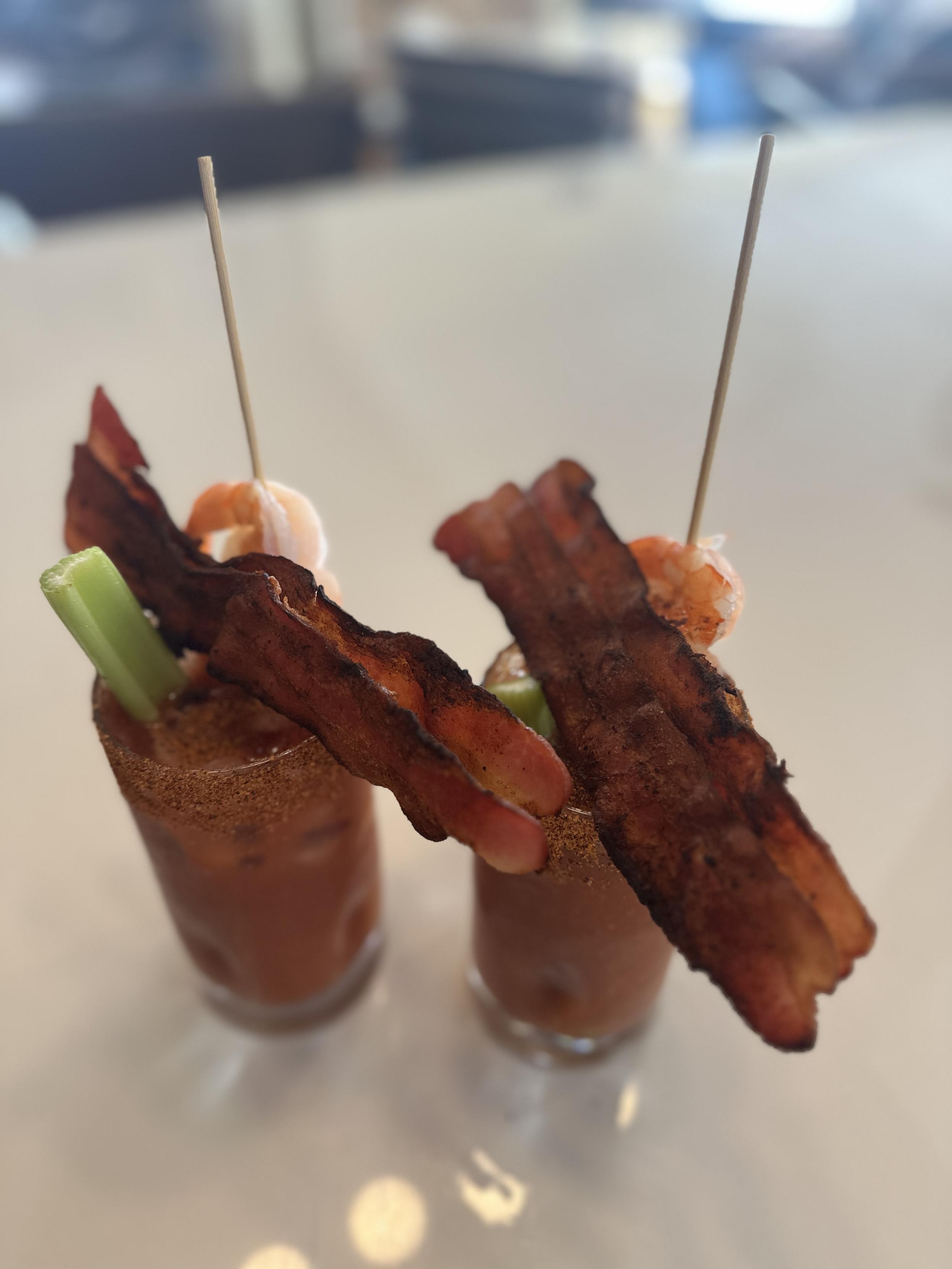 Two Bloody Marys are garnished with crispy bacon strips, shrimp, and celery, served in glasses with a seasoned rim.