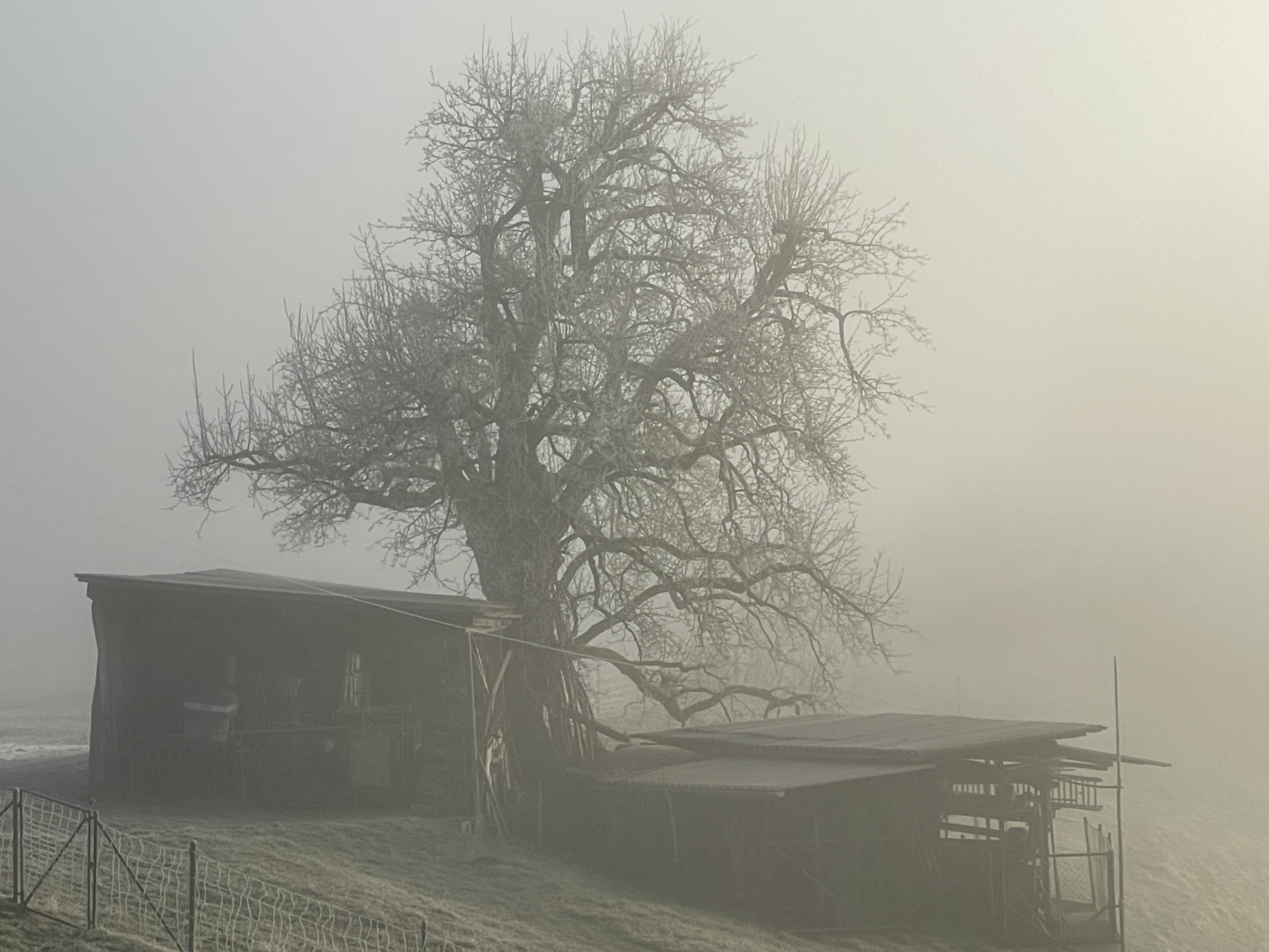 Nachbars Unterstand mit Birnbaum sieht im Nebel noch mystischer aus.