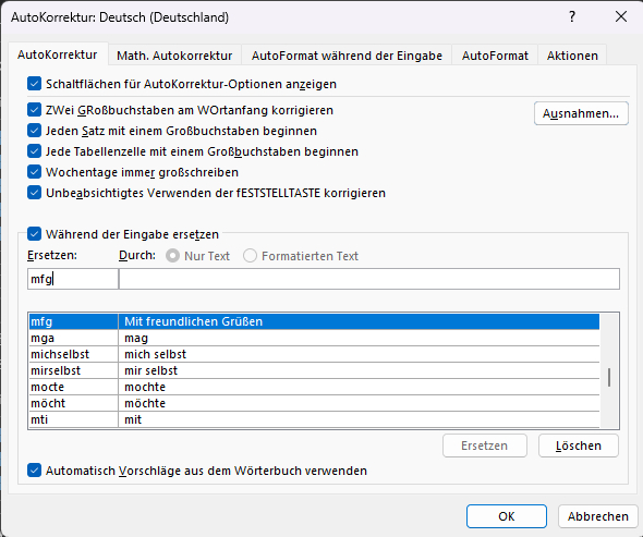 #windowshack #office Um in Outlook (oder in Word) nicht ständig "Mit freundlichen Grüßen" ausschreiben zu müssen, nutze ich die Autokorrektur. Datei > Optionen > E-Mail > Rechtschreibung & Autokorrektur > Autokorrektur-Optionen Ersetzen: mfg Durch: Mit freundlichen Grüßen