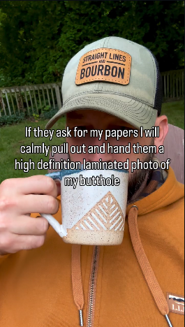 @straight_lines_and_bourbon, a Texas anti-ICE influencer posts a picture of himself, a white man in a freaking L L Bean hoodie, drinking out of a bougie mug, with text that reads "If they ask for my papers I will calmly pull out and hand them a high definition laminated photo of my butthole."