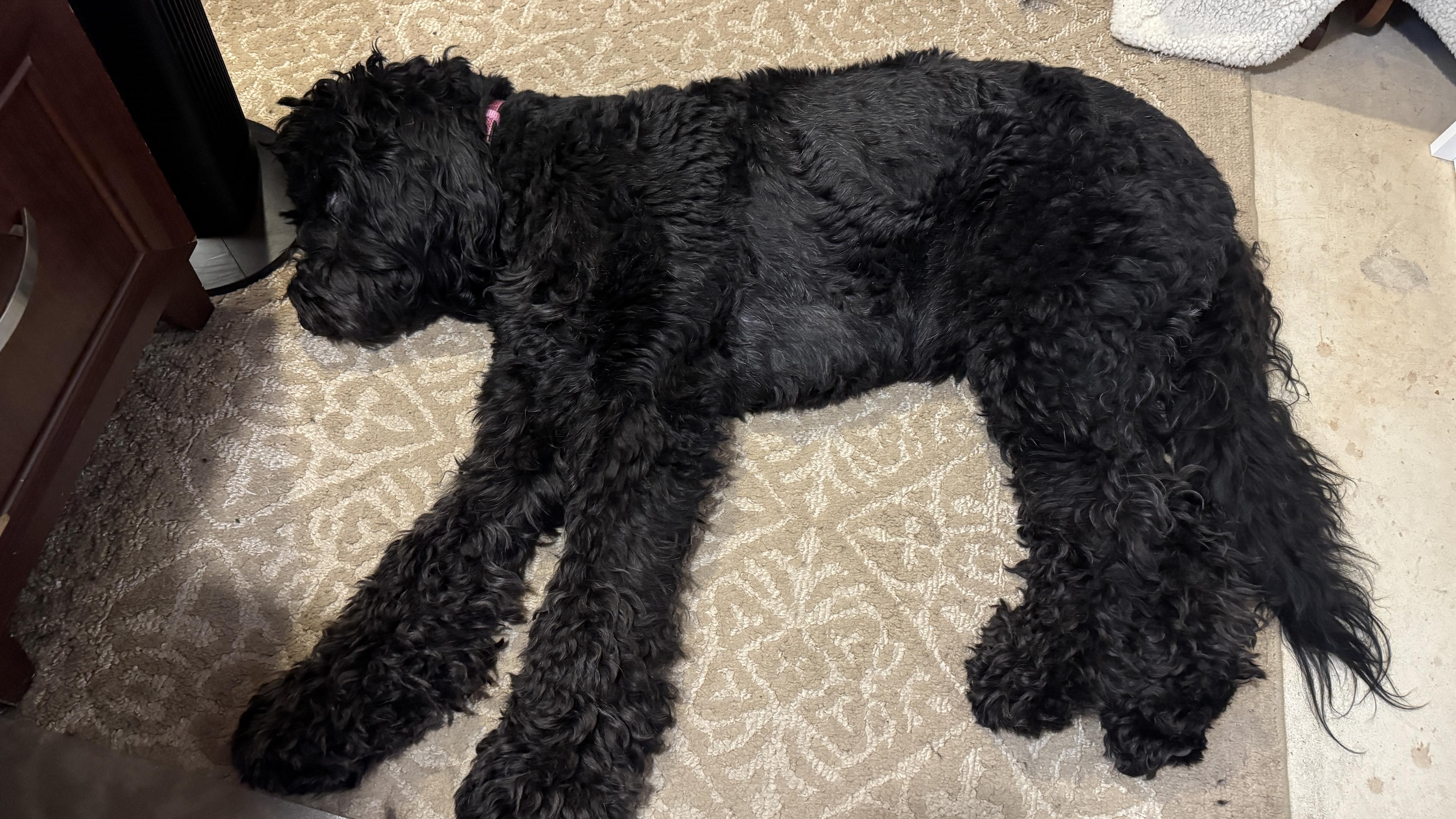 My baby girl keeping me company as I get some work done between digging out from this fucking #snowstorm #snowstorm2026 #BucksCounty #dogsofmastodon #dogsofthefediverse #airedoodle