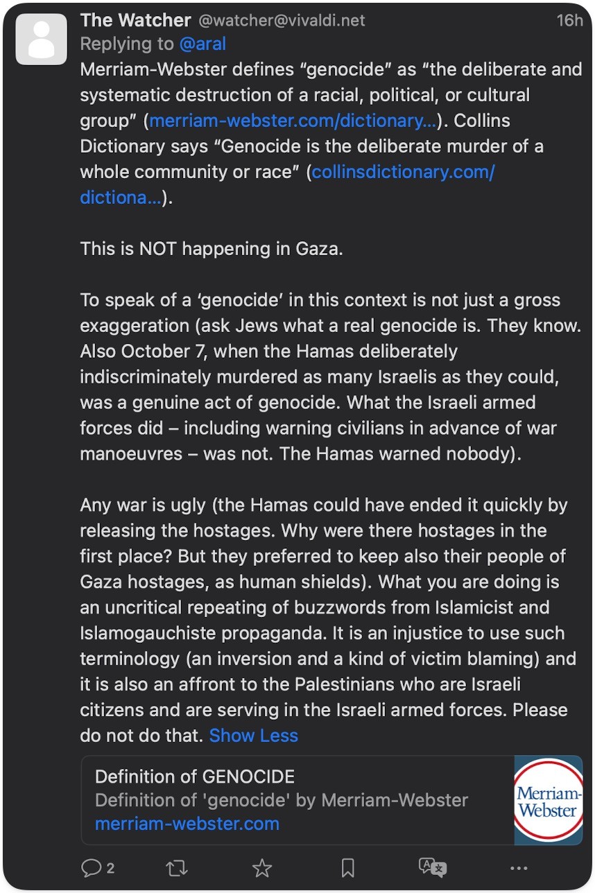 Also October 7, when the Hamas deliberately indiscriminately murdered as many Israelis as they could, was a genuine act of genocide. What the Israeli armed forces did - including warning civilians in advance of war manoeuvres - was not. The Hamas warned nobody).
