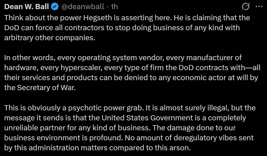 Anthropic’s stance is fundamentally incompatible with American principles. Their relationship with the United States Armed Forces and the Federal Government has therefore been permanently altered.